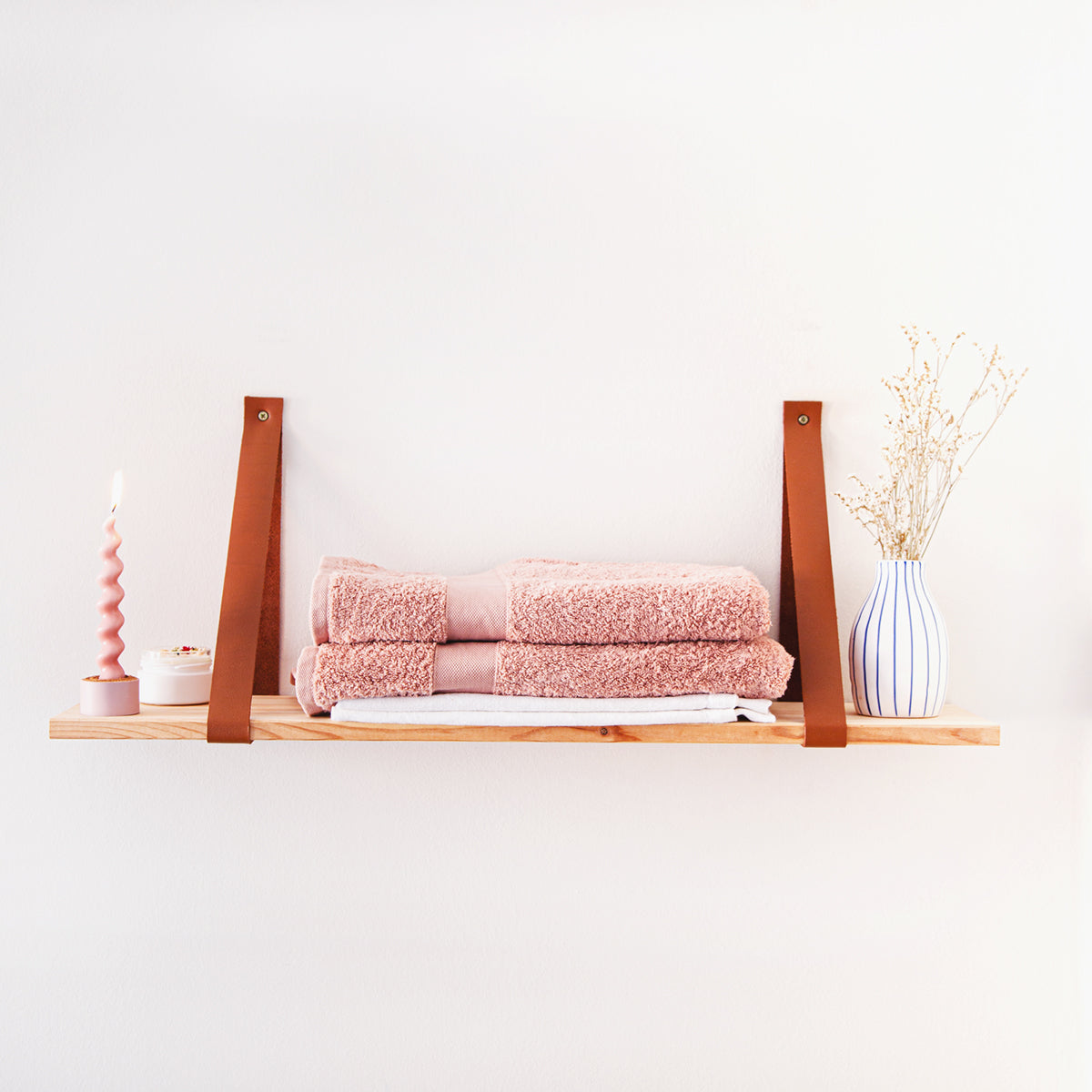 Recibirás, no solo las cintas de cuero y la balda de madera, pero también los tacos y tornillos necesarios para que sea: recibirla y colgarla.